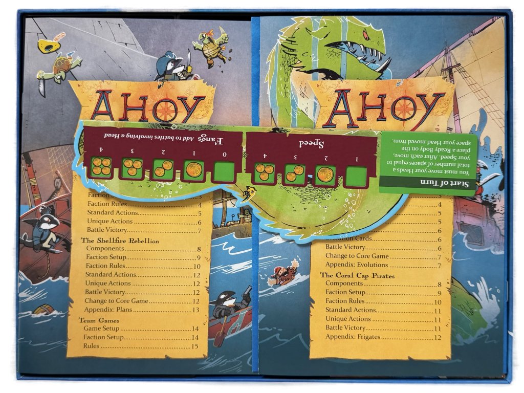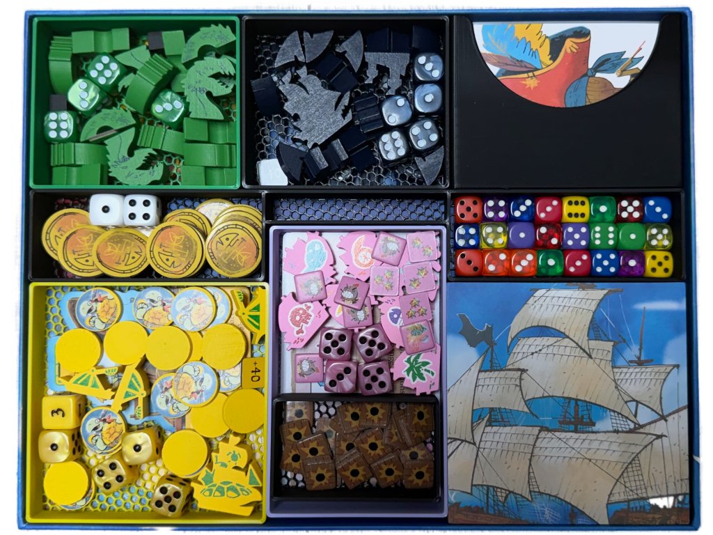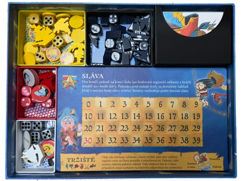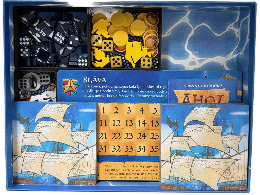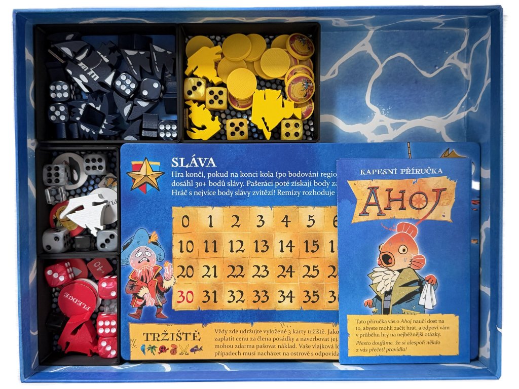 3D tištěný insert našeho fanouška a věrného zákazníka Ondry pro deskovou hru Ahoj (2022) včetně rozšíření Fang & Fortune (2025), Rivals & Renegades (2025) a mini rozšíření Treasure Pack (2025).