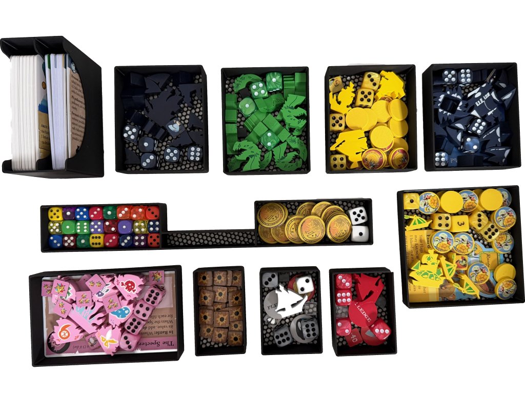 Insert je navržen tak, aby výrazně zrychlil přípravu i úklid hry a udržel pořádek ve všech rozšířeních. Všechny komponenty mají své místo a lze je bezpečně skladovat i ve vertikální poloze bez rizika rozsypání.