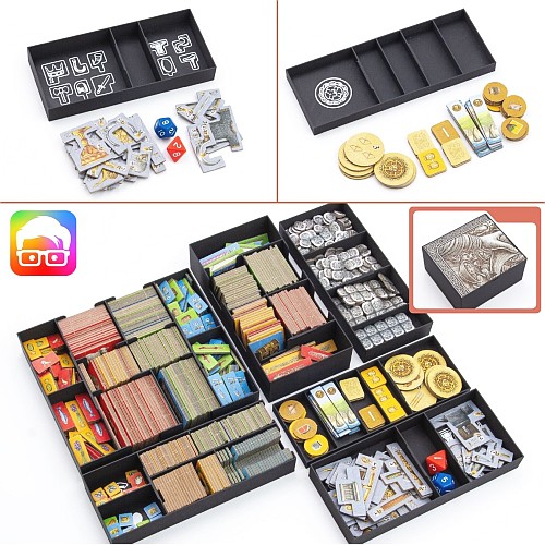 The insert is designed to organize all base game components inside the original box. Thanks to lockable lids, you can store the box horizontally or vertically without anything falling out. The insert supports sleeved cards.