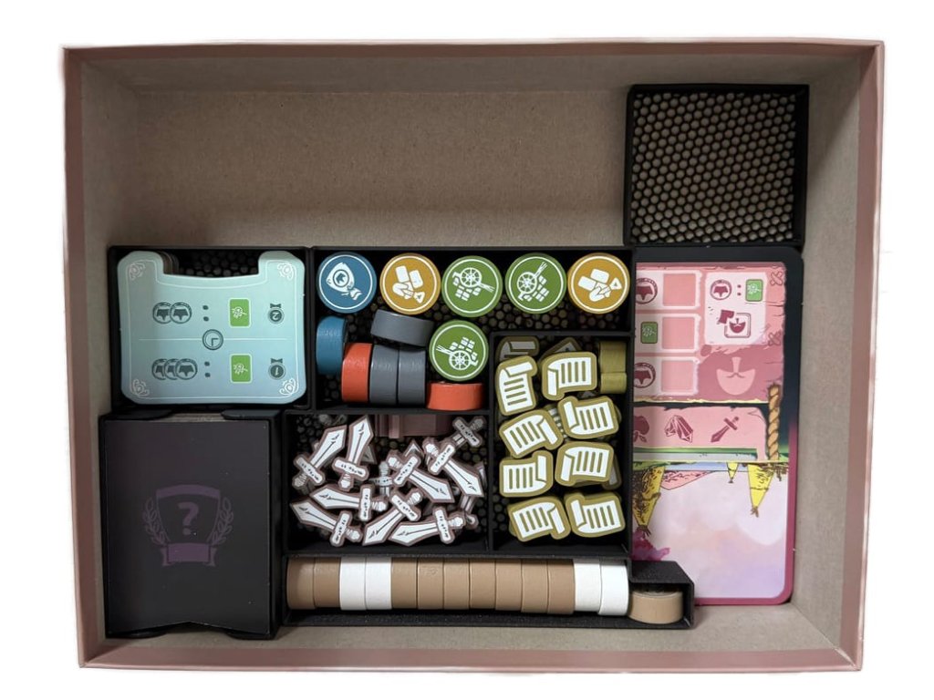 The insert is designed to significantly speed up game setup and cleanup while keeping the box organized. All components have their own place, and everything can be safely stored vertically without the risk of spilling.