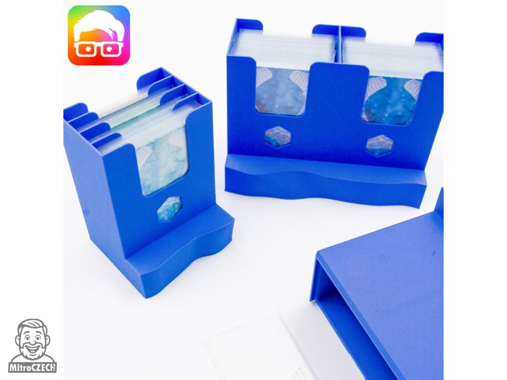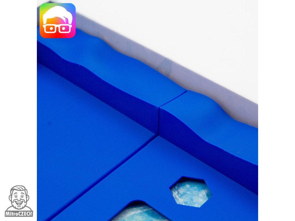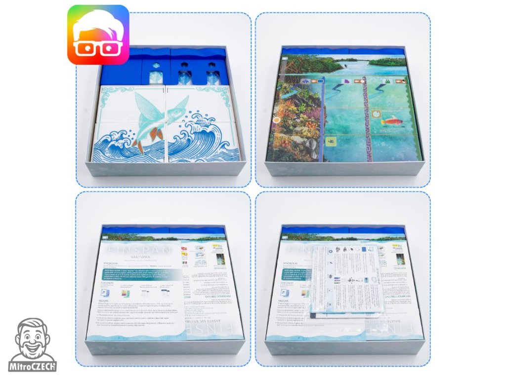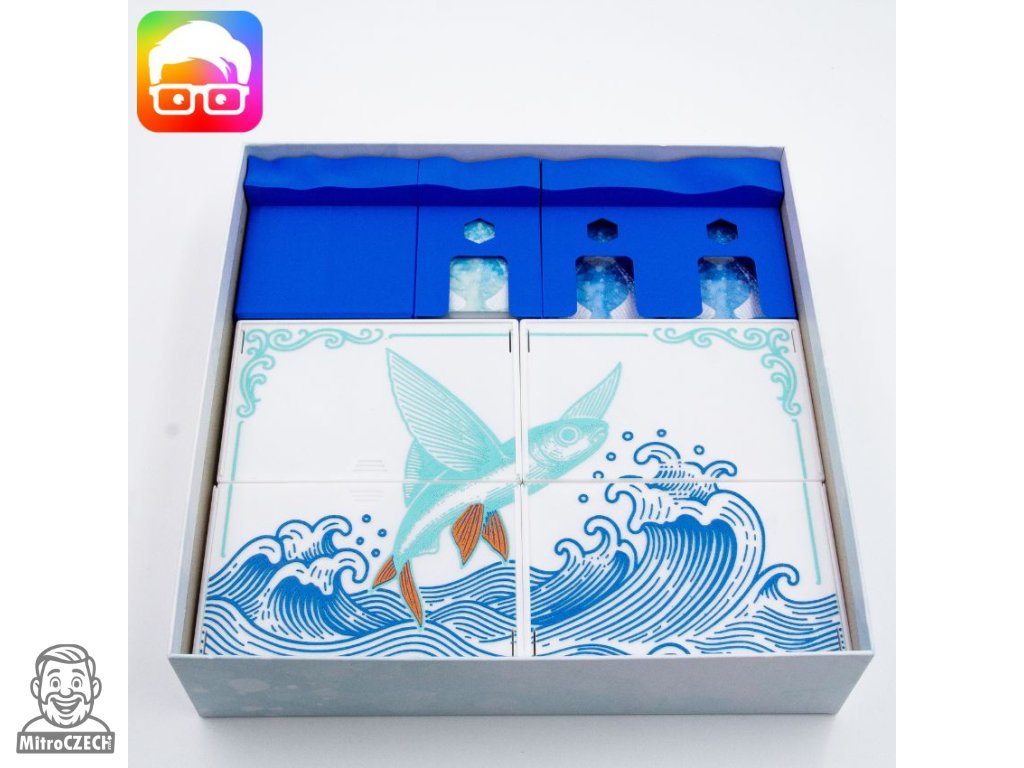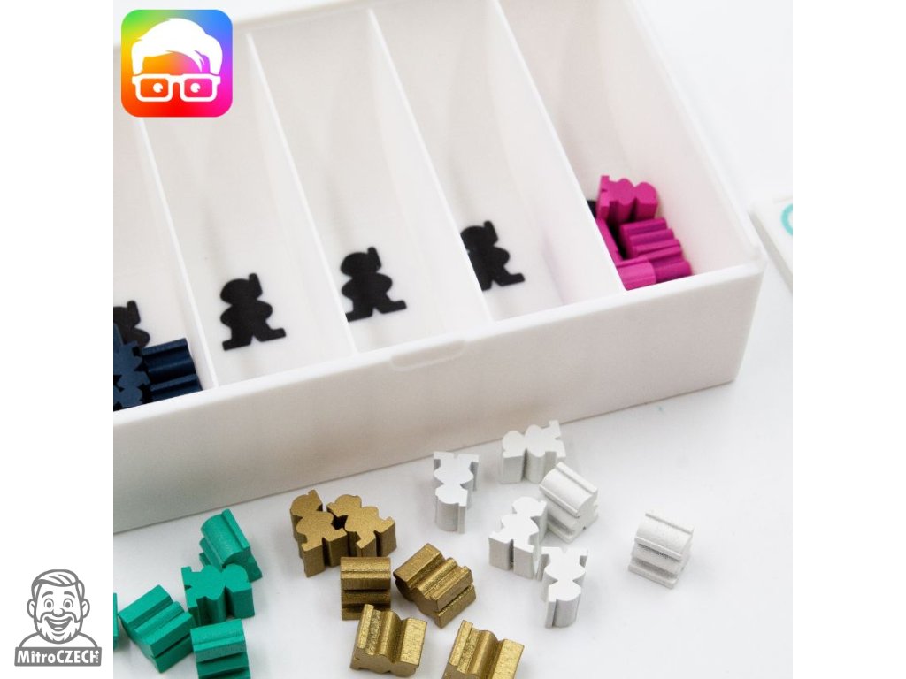 The insert is designed to organize all components of the base game inside the original box. Thanks to the locking lids, you can store the box horizontally or vertically without anything falling out. The insert supports sleeved cards.