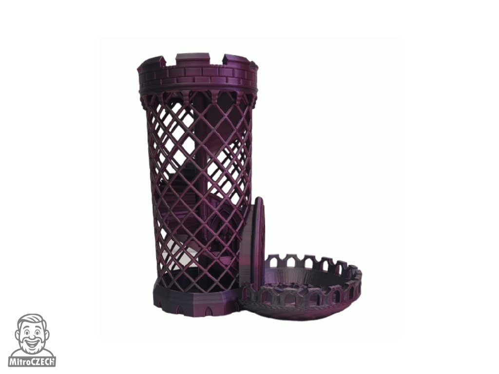 3D tištěná házecí věž na kostky s integrovanou miskou pro plynulé a tiché házení. Díky konstrukci z jednoho kusu („print-in-place“) není nutná žádná montáž – věž je kompletně připravena k okamžitému použití.