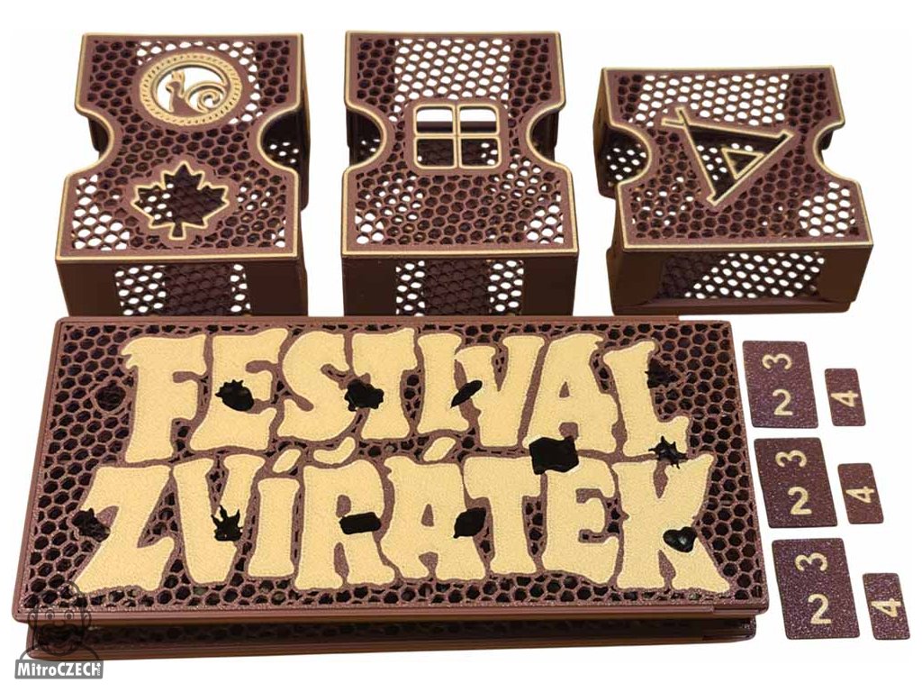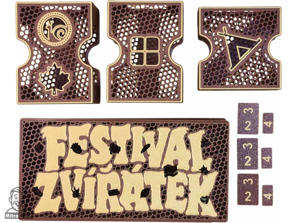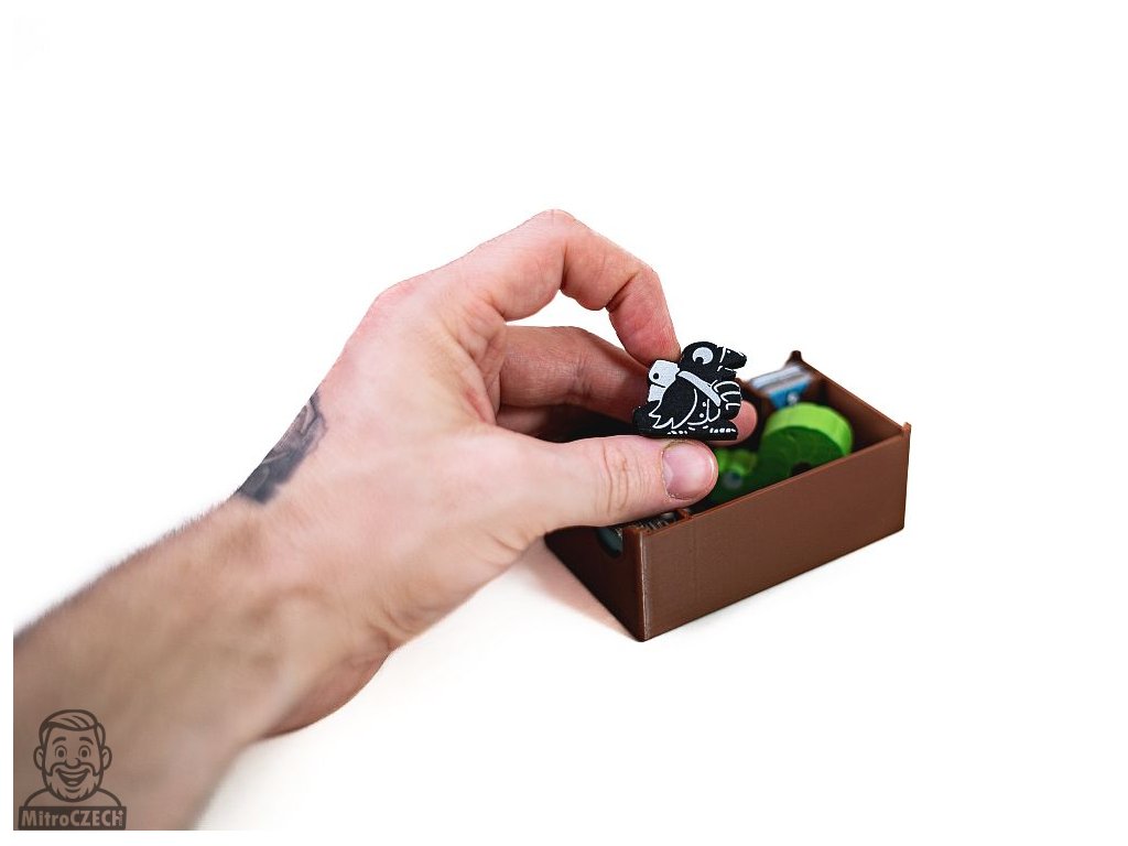 Insert vytvořený pomocí 3D tisku pro deskovou hru Festival zvířátek (2023), rozšíření Havraní poutník (2023) a Opeření kamarádi (2023).
