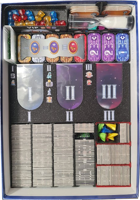 Jedinečný 3D tištěný insert s licencovaným UV potiskem pro deskovou hru Galaxy Trucker: Druhé, vytuněné vydání (2021) + Jedeme dál! (2022) a Do What?! (2025).