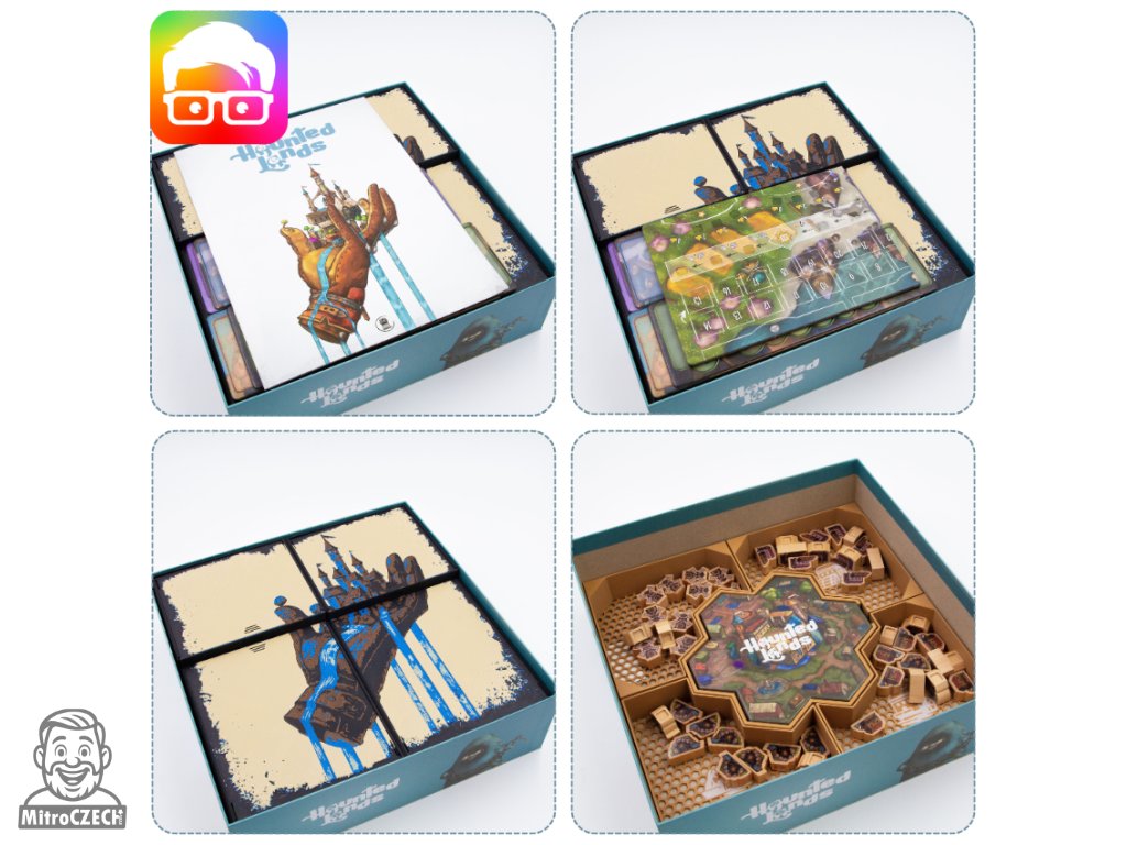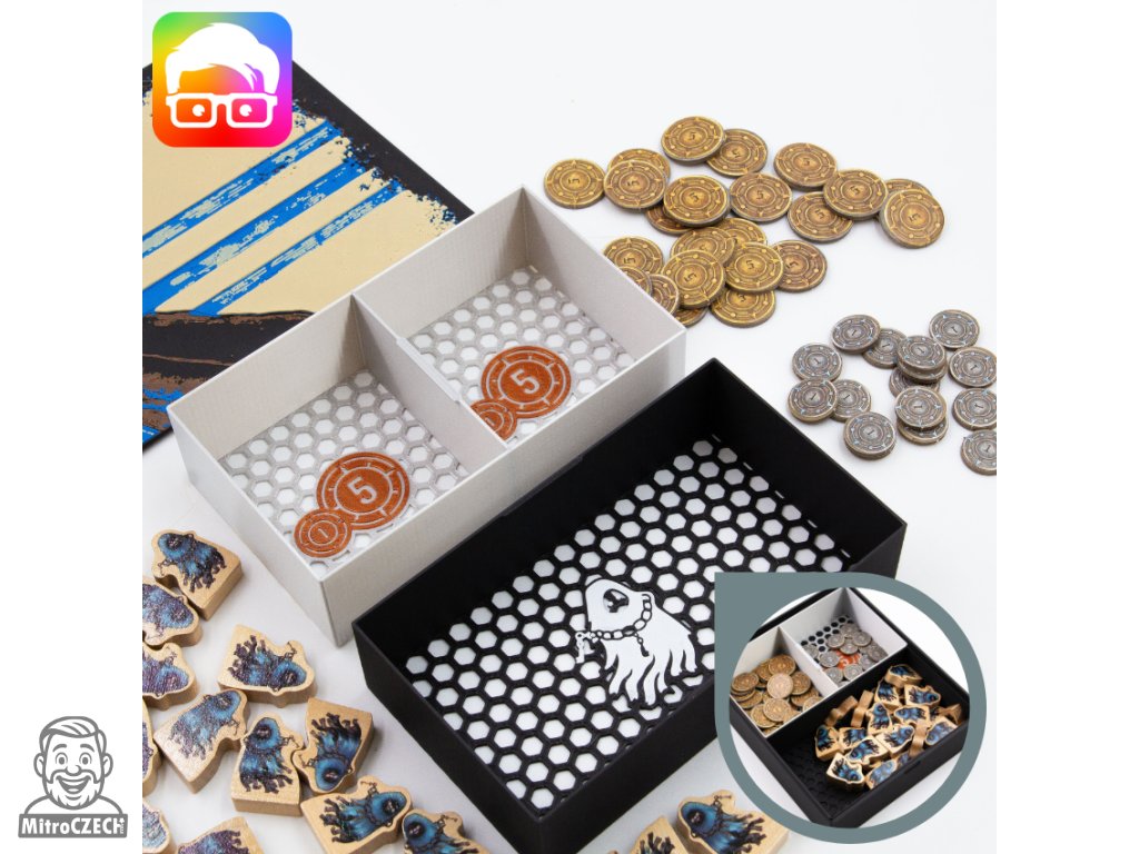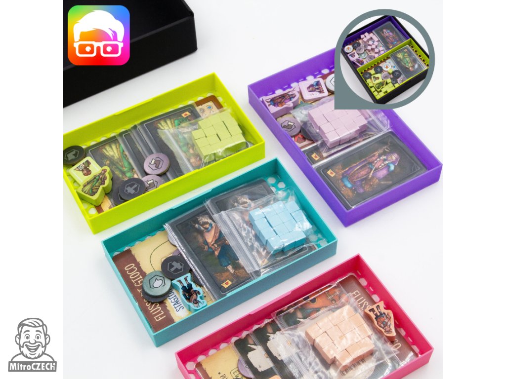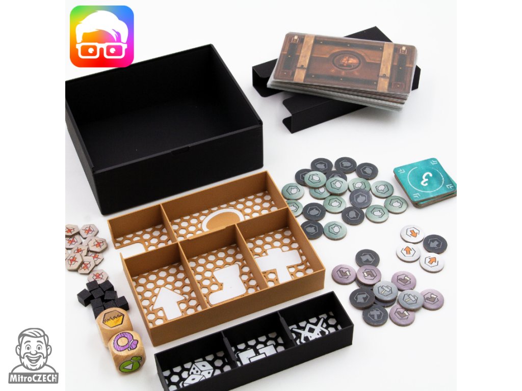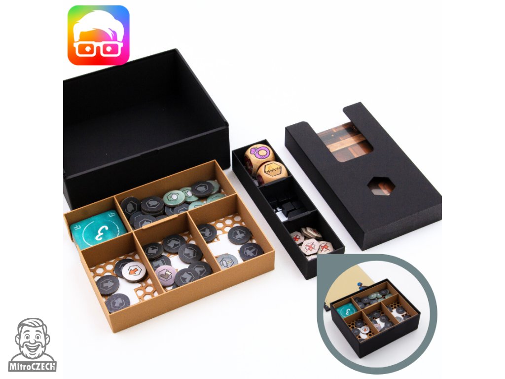 Insert je navržený tak, aby uspořádal všechny součásti základní hry uvnitř originální krabice. Díky zámkovým víčkům můžete krabici bez obav umístit vodorovně nebo svisle a z krabice nebude nic vypadávat. Insert podporuje obalené karty.