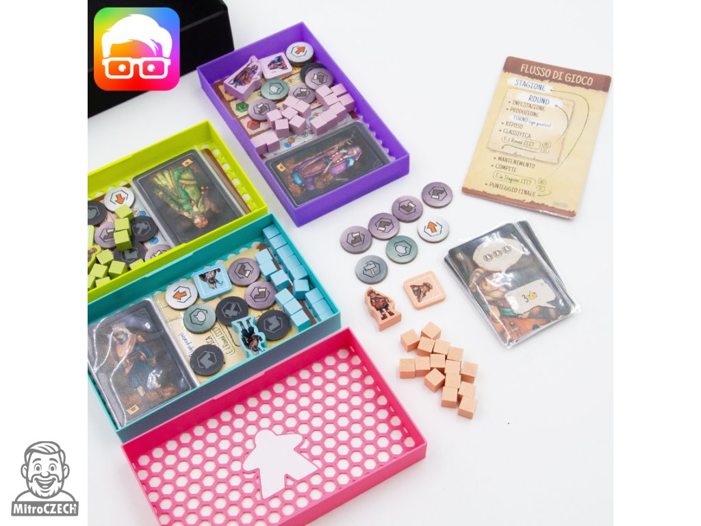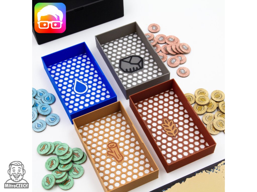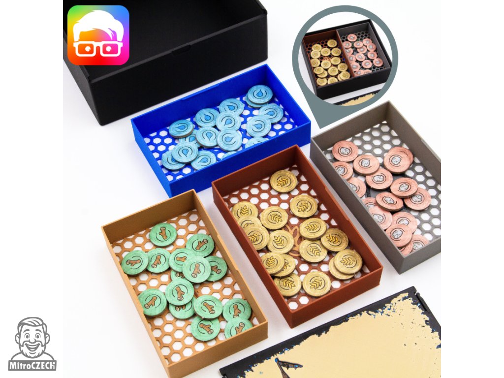 - 4 krabičky s víky a pořadači pro žetony a herní komponenty