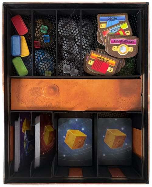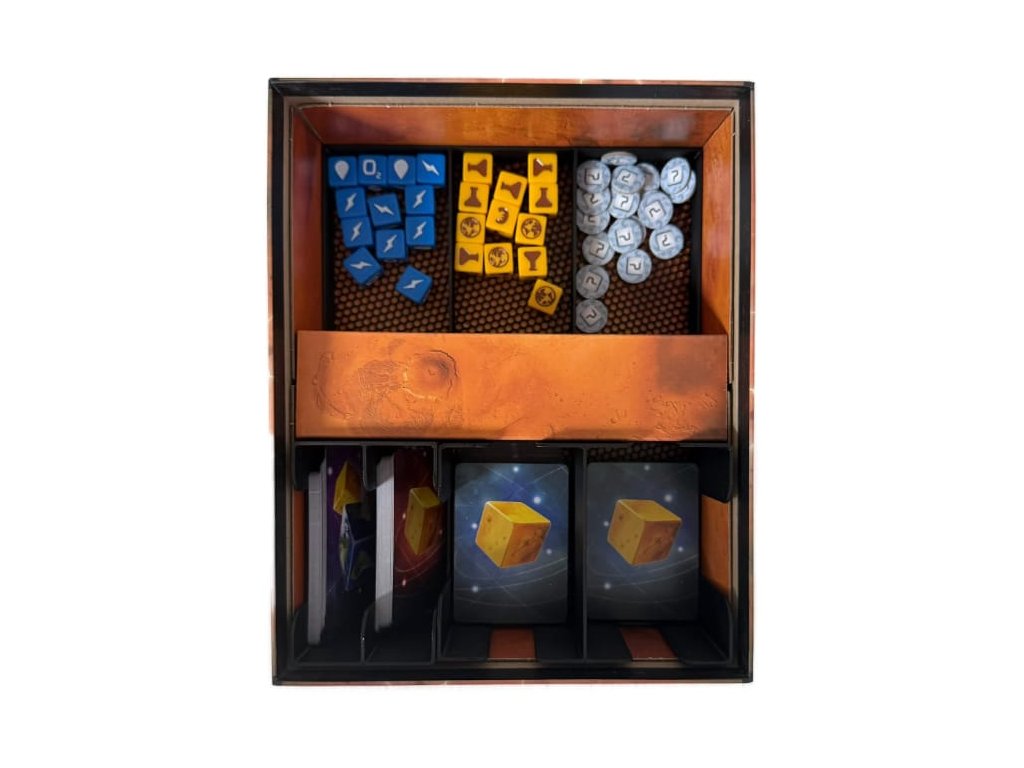 3D tištěný insert našeho fanouška a věrného zákazníka Ondry pro deskovou hru Mars: Teraformace - kostková hra (2023) včetně rozšíření Mise (2025) + Promo rozšíření (2023).