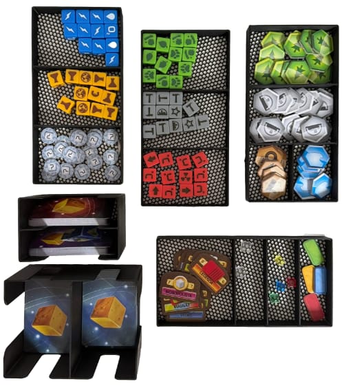 Insert je navržen tak, aby výrazně zrychlil přípravu i úklid hry a udržel pořádek ve všech rozšířeních. Všechny komponenty mají své místo a lze je bezpečně skladovat i ve vertikální poloze bez rizika rozsypání.