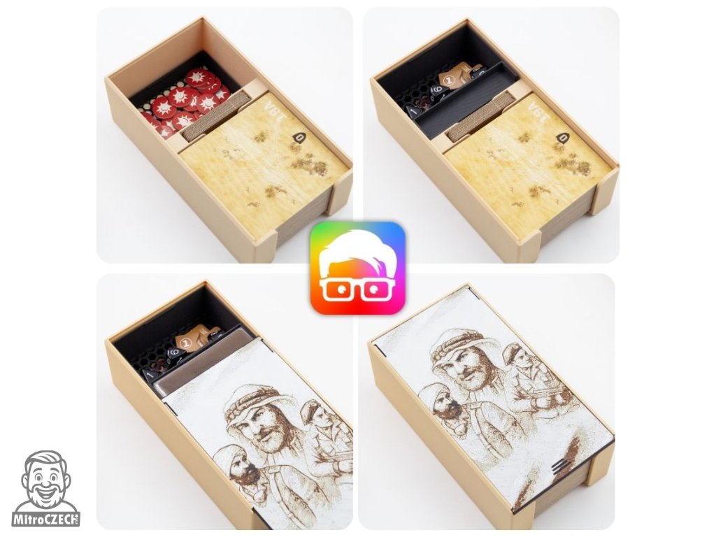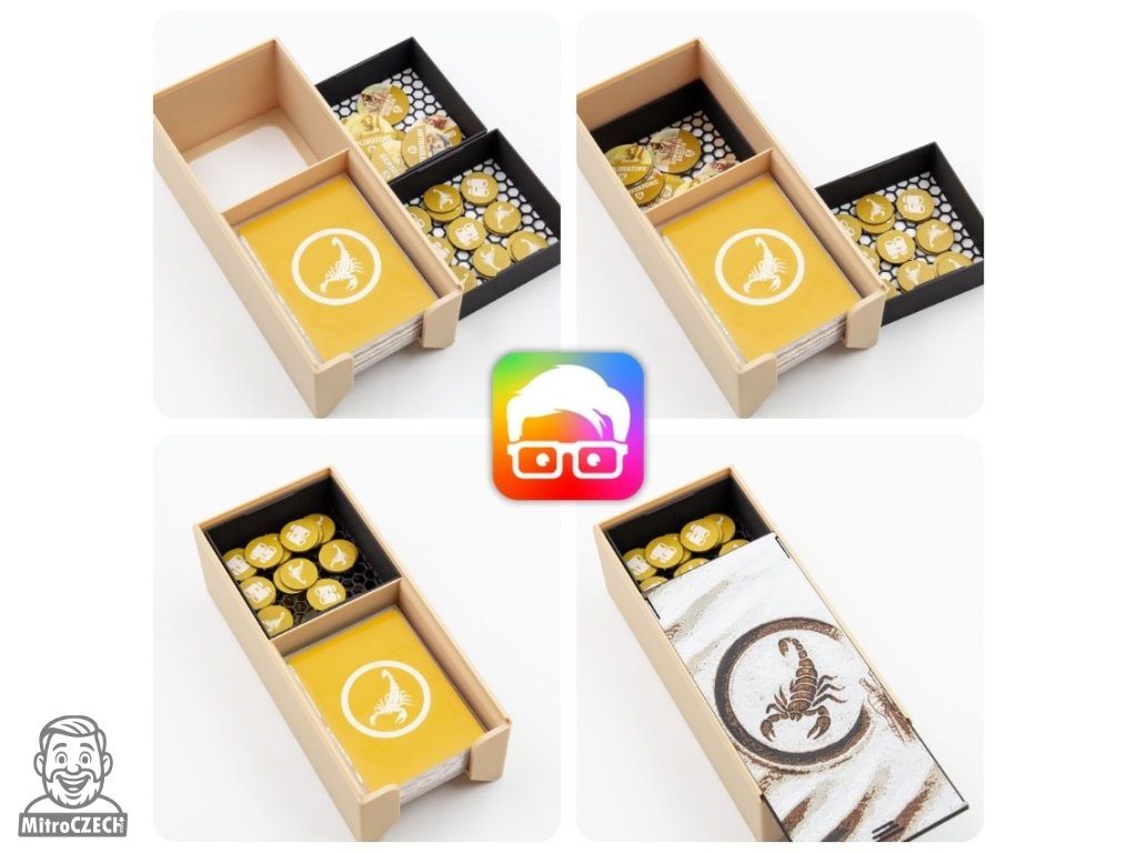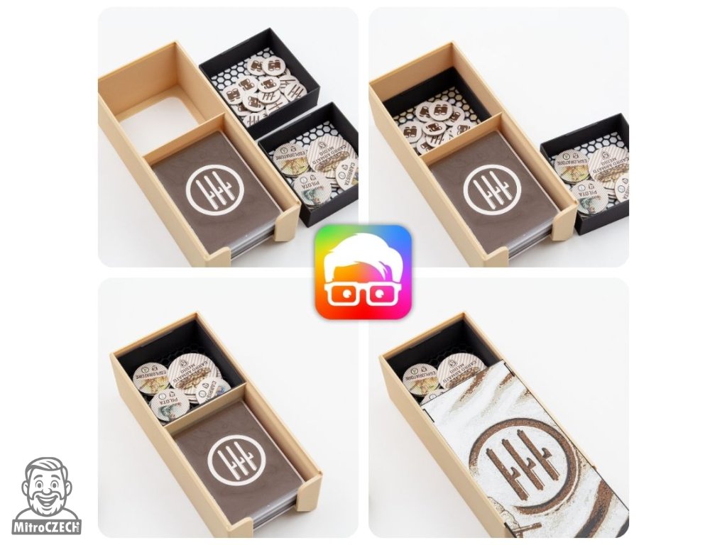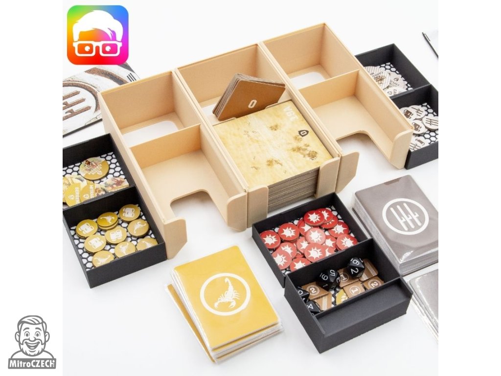 Insert je navržený tak, aby uspořádal všechny součásti základní hry uvnitř originální krabice. Díky zámkovým víčkům můžete krabici bez obav umístit vodorovně nebo svisle a z krabice nebude nic vypadávat. Insert podporuje obalené karty.