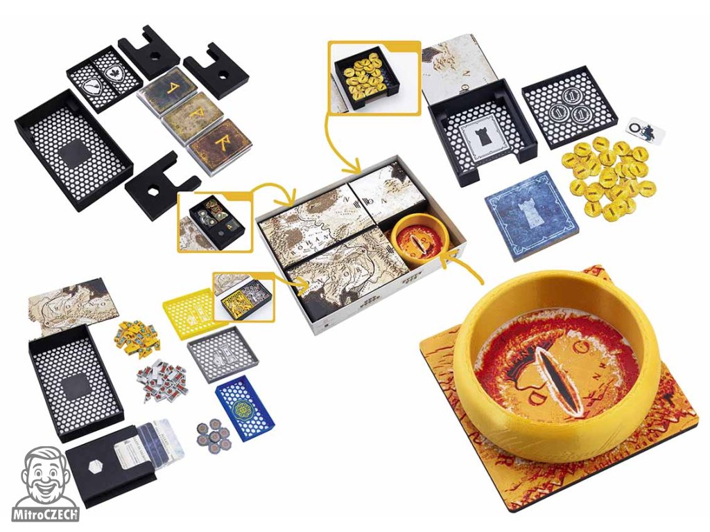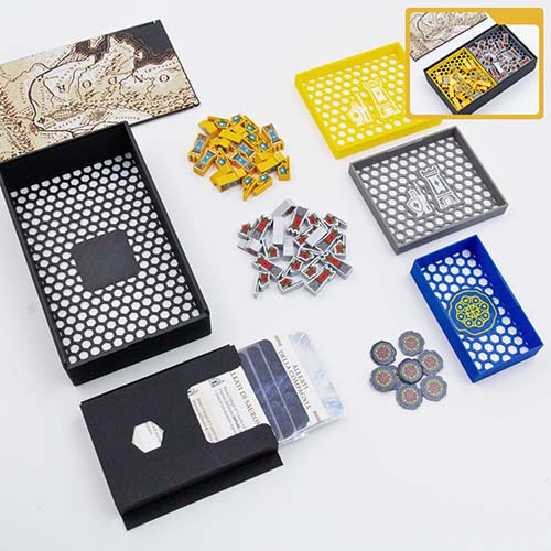 Insert je navržen tak, aby uspořádal všechny součásti základní hry uvnitř originální krabice. Díky zámkovým víčkům můžete krabici bez obav umístit vodorovně nebo svisle a z krabice nebude nic vypadávat. Insert podporuje obalené karty.