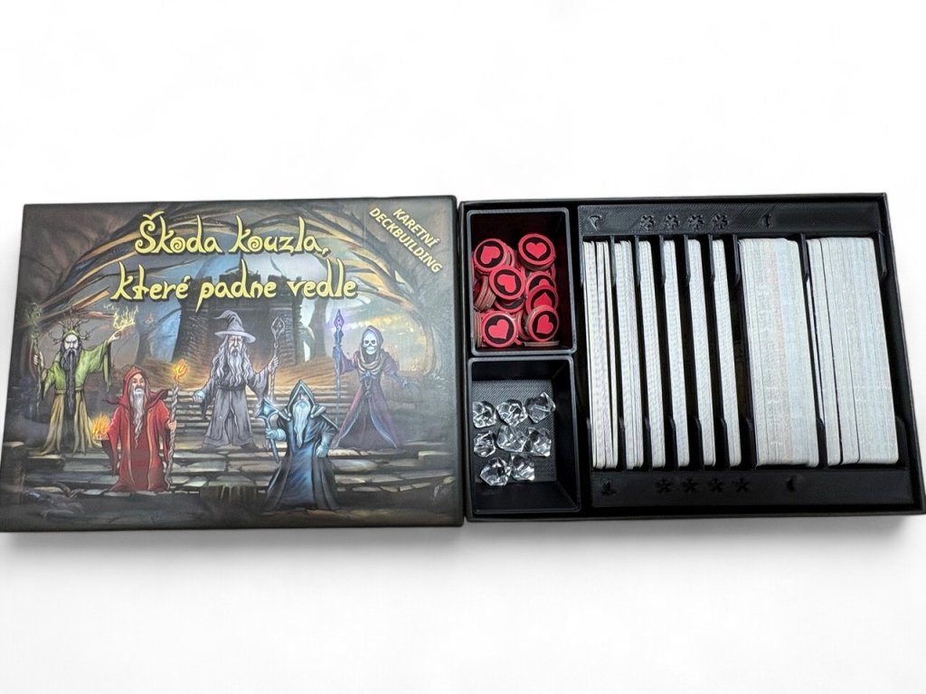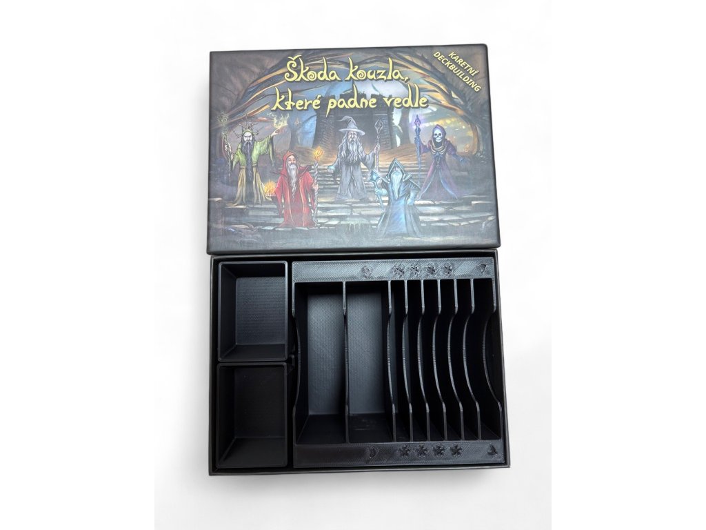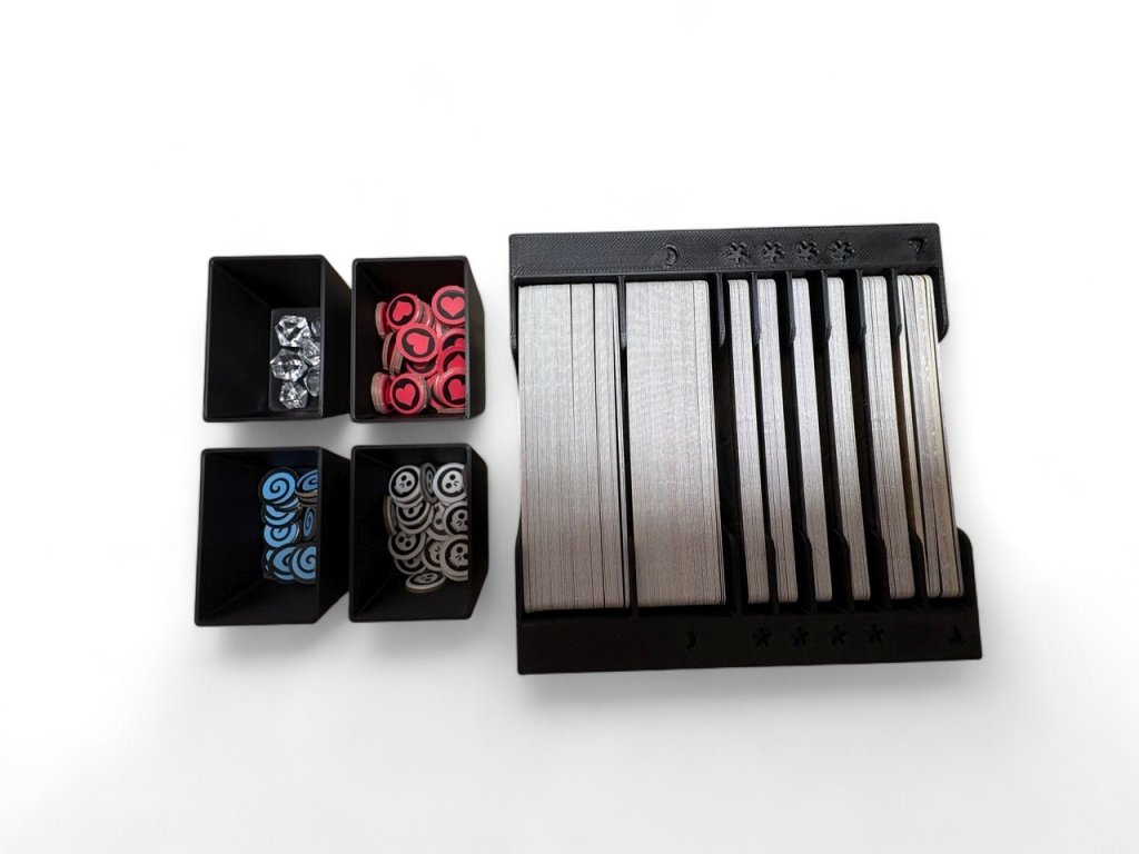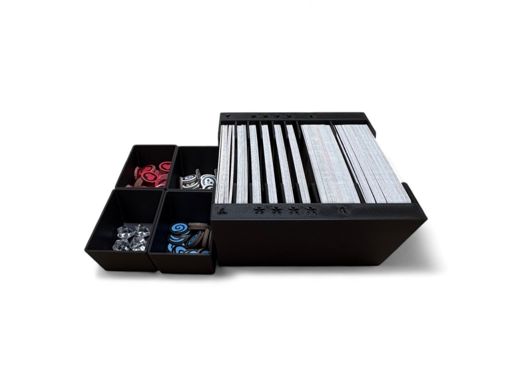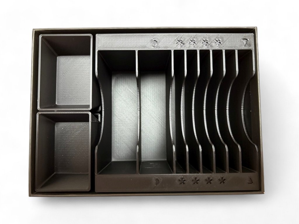 Insert je navržen tak, aby výrazně zrychlil přípravu i úklid hry a udržel pořádek ve všech rozšířeních. Všechny komponenty mají své místo a lze je bezpečně skladovat i ve vertikální poloze bez rizika rozsypání.