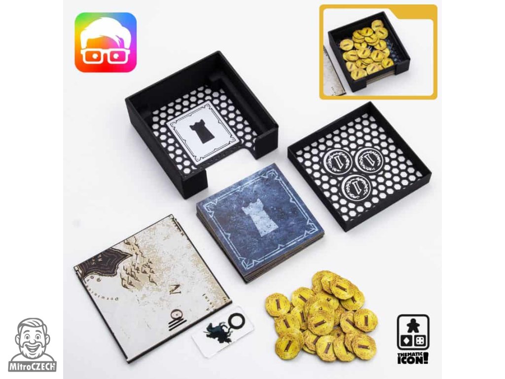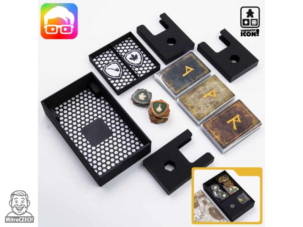 Insert je navržen tak, aby uspořádal všechny součásti základní hry uvnitř originální krabice. Díky zámkovým víčkům můžete krabici bez obav umístit vodorovně nebo svisle a z krabice nebude nic vypadávat. Insert podporuje obalené karty.
